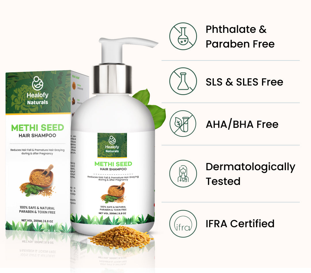 Fight-off all your postpartum hair concerns, from hair fall to greying and brittle, frizzy hair, with Healofy's specialized Methi Hair Care Solution. With its estrogenic properties, it effectively reduces hair fall and revitalizes your hair. Free from SLS and other breastfeeding-unsafe ingredients, it's a perfect choice for your precious journey.